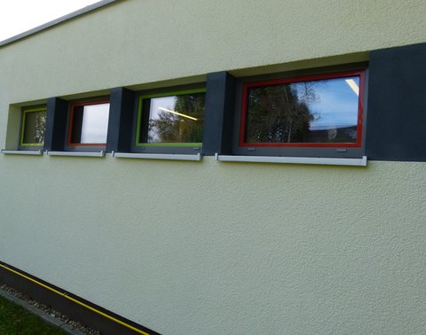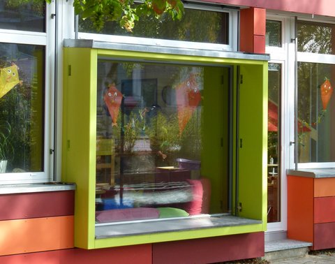 Wichtig war uns der Innenraum-Außenraumbezug in den Gruppenräumen, so dass wir für die Kinder ein nach innen und außen auskragendes Kastenelement entwickelten. Dieses für die neue Fassade prägende Gestaltungselement ermöglichte uns, die Brüstung an fünf Stellen der Gruppenräume auf Kinderhöhe runter zu nehmen. Die "bunten Kästen" nutzen die Kinder nun innen und außen wahlweise als Sitzbänke, Spieltische oder Ablagefläche. Die etwas versteckte Eingangssituation des Kindergartens von Seiten des Gemeindehauses her, konnte von uns durch diesen gestalterischen Trick ebenfalls aufgewertet werden: In einem der Kastenfenster sitzen die Kinder sehr gerne, um die kommenden und gehenden Eltern zu beobachten, was vorher durch die hohen Brüstungen nicht möglich war.