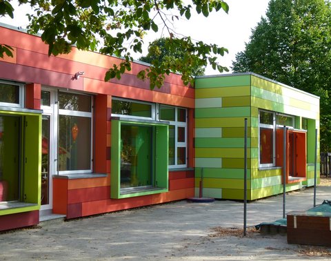 Nach einer Bestandsanalyse der Fassadenkonstruktion und der räumlichen Organisation des Kindergartens, sowie Gesprächen mit den Erzieherinnen, arbeiteten wir mehrere Entwurfs-Varianten einschließlich verschiedener Farb- und Materialkonzepte aus. Die ausgeführte Fassadengestaltung zeichnet sich nun durch eine farbenfrohe Fassadenverkleidung aus, die die zwei Baukuben der einzelnen Gruppenräume in Grün- und Orange-Rot-Tönen voneinander absetzt. Der rückwärtige Baukörper, in dem die Versorgungsräume liegen, wurde differenziert abgesetzt durch eine helle Putzfassade. Der Entwurf unterstreicht den kubischen Entwurfsansatz des Hauses von 1970.