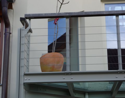 Besonderer Augenmerk im Entwurfskonzept zur Wohnwertsteigerung galt dem Bau des neuen Balkons mit Holzterrasse, dessen Tragwerk als filigrane Stahlkonstruktion und Geländer mit maritimem Charakter durchdetailliert wurde. Von den Bauherren kam in dieser Bearbeitungsphase der Wunsch auf, für den Boden des Balkons begehbares Glas zu verwenden, um den bis dahin in diesem Bereich eher dunklen Wohnraum schöner zu belichten.
