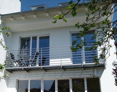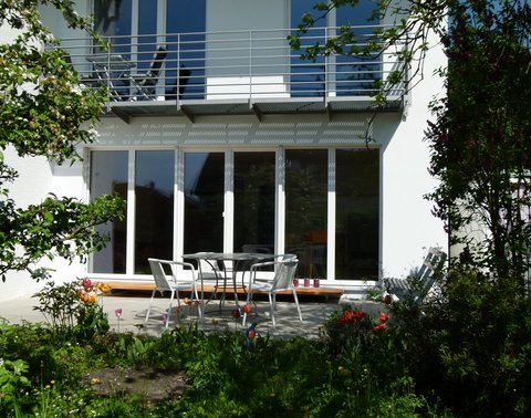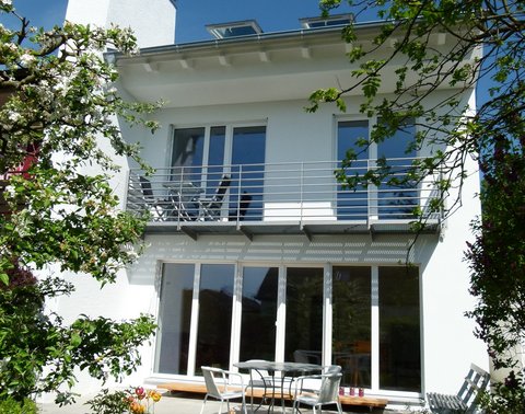Gestalterisch wurde ein vollkommen neues "Outfit" entwickelt, auch um die Sonnenenergie als Lichtquelle und Wärmelieferant besser zu nutzen: Der große Balkon an der Süd- / Ostfassade wurde als erhebliche Wärmebrücke aus den 70ern abgerissen und die Fensteröffnungen wurden zur passiven Energiegewinnung vergrößert. Eine neue zeitlose nach Süden orientierte Balkonkonstruktion im Obergeschoss schafft nun den fließenden Übergang zwischen Innen- und Außenraum. Der Austritt vom Wohnzimmer auf die Terrasse wurde als gleichzeitige Trittstufe und Sitzgelegenheit aus Holzpaneelen entworfen. Hochdämmende Dachfenster sind nun in den Dachaufbau integriert.